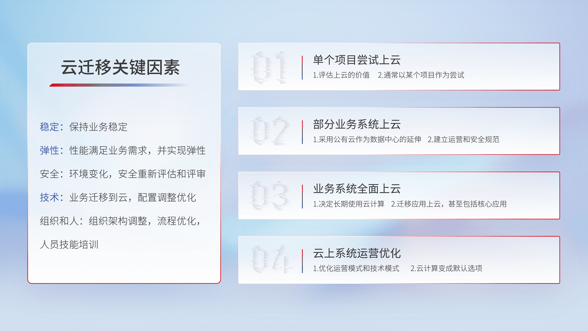 结合实际业务,,,,从规划设计、、、云平台选型、、、、云原生改造、、、数据迁移、、、、集成交付,,迁移全过程为客户识别最佳上云路径,,,,做好风险识别管理,,设计网络架构、、、身份权限、、、、安全审计合规、、操作审计、、、、日志审计、、、监控告警策略、、、、多站点容灾设计等,,对云上基础设施进行整体规划,,提升IT治理水平,,,以满足弹性、、、、高可用、、、高性能的需求。。。。